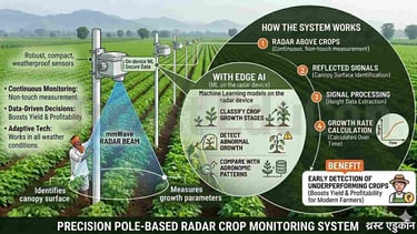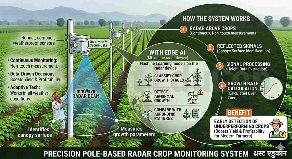 mmWave रडार पौधों को छुए बिना फसल की ऊँचाई और उसकी सघनता (canopy growth) को लगातार माप सकता है।