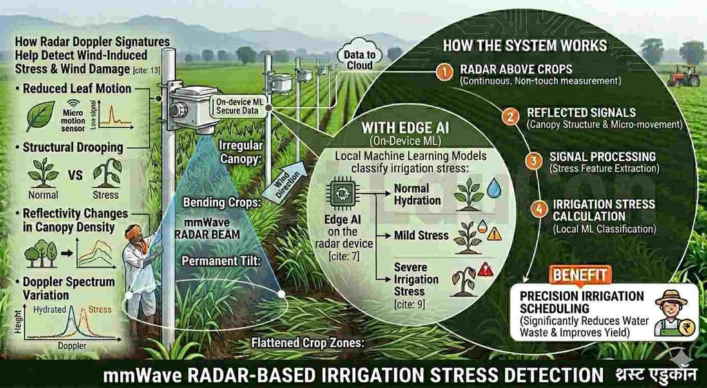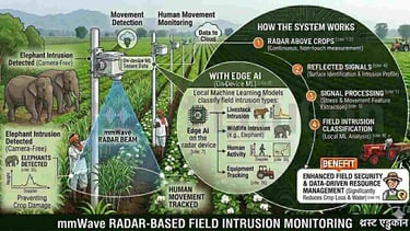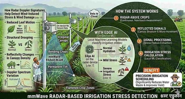 अर्ध-शुष्क कृषि क्षेत्रों में पानी की कमी एक प्रमुख चिंता का विषय है। स्थानीय mmWave रडार + एज़ एआई (Edge AI) प्रणालियाँ निम्नलिखित कार्य कर सकती हैं: